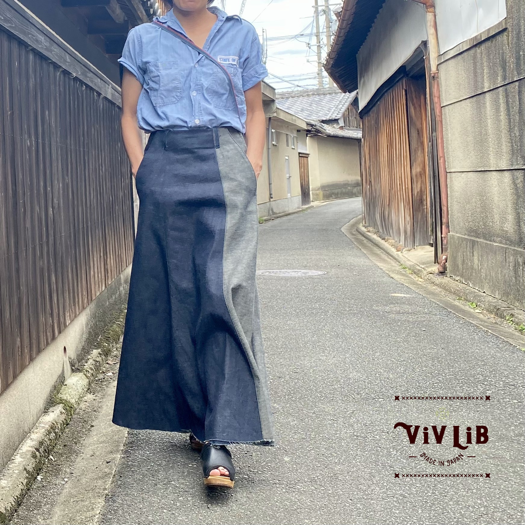2.バイカラー(裏地使いのコントラストが際立ちます。)→https://vivlib.work/onlilnestore/apparel/skirts-onepieces/skirts/okayama-denim-maxi-skirt-bicolor/