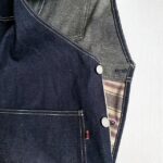 デニム生地は、日本の誇れるデニムの名産地、井原産の生地で別注糸を使用し不規則性に織ったネップ感のある生地表面に特徴のある9.5ozの右綾セルビッジのインディゴデニム生地。